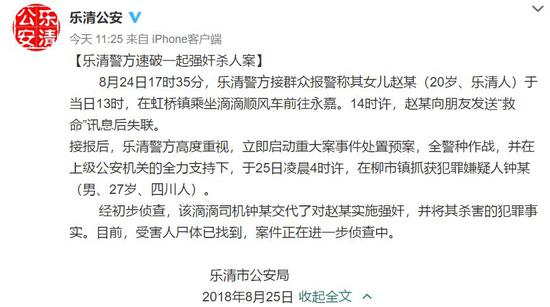 24日,浙江温州乐清一名20岁女孩赵某在上了一辆滴滴顺风车后失联。25日,@乐清公安 官方微博发布通告,称失联女孩赵某遗体已被寻获,犯罪嫌疑人为顺风车司机钟某,已被抓获。钟某随后交代了强奸并杀害赵某的犯罪事实。