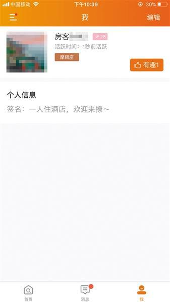 “趣住”App口号:“相遇在酒店”,昨日,记者体验发现,注册后用户个人签名则被自动填写为:“一人住酒店,欢迎来撩”。