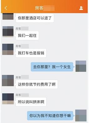 记者随机与一位名房客私聊,对方显得活跃话多,并开门见山邀请:“在北京吗?晚上一起。我出差这里。”并报出自己的酒店位置,表示打车可以报销。当记者问及是否“常用这个软件”以及软件的用途,对方说是第一次用,但理解中就是拼床用的,可节省费用。