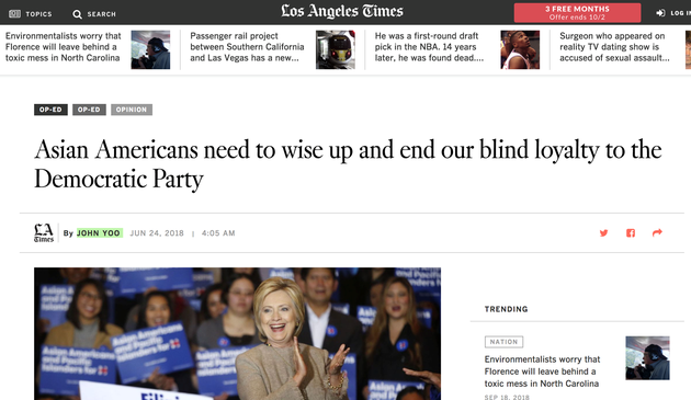 在被黄馨祥收购之后,《洛杉矶时报》近期的一系列报道似乎暗示着,这家报纸原先的政治立场似乎略有改变。伯克利法学教授韩裔美国人John Yoo在该报撰写社论《亚裔美国人需要更加理智,不必盲目支持民主党》,斥责民主党提出的平权法案实际上对亚裔学生构成了歧视,亚裔需要根据政策来选择自己的选票。这篇社论引发了亚裔社区的巨大反响,在民主党占据绝对优势的加州,这原本是难以想象的。