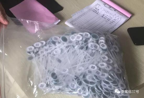 ▲9月17日,消泾村附近一家大闸蟹礼盒包装店的老板拿出一袋阳澄湖大闸蟹防伪蟹扣售卖,价格在1毛钱到2元钱不等。新京报记者 半年/摄
