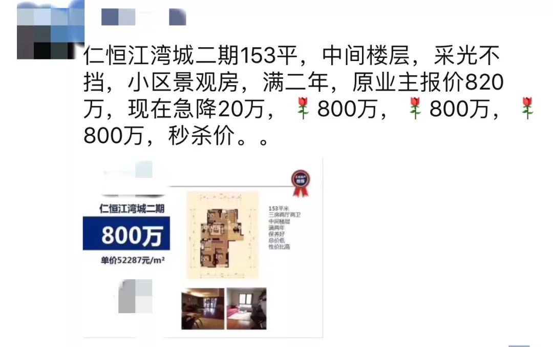 1、仁恒江湾城二期153㎡,满两年,原报价820万,现在急降20万。