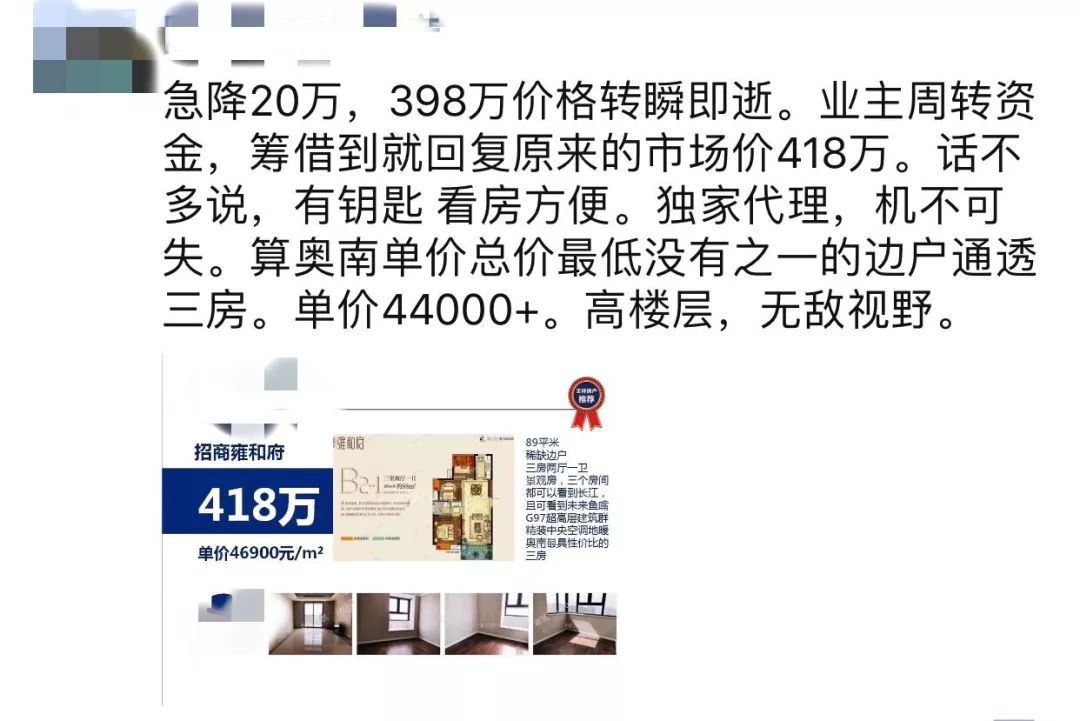 3、招商雍和府89㎡,业主周转资金急降20万,如果借到钱了,就恢复到原来的418万。