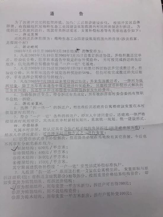 2003年2月18日,经开区蛟桥镇人民政府对外发出《征收通告》。《征收通告》上写明,为了改善开发区的投资环境,加快开发区经济建设步伐,按照开发区总体部署,由蛟桥镇组织对梅岭生态工业园建设规划范围内村民的房屋进行拆迁,本次拆迁具体范围涉及蛟桥镇范家村和龙潭村。补偿方式分为房屋补偿(拆一还一、一户一宅)和货币补偿。选择“拆一还一”的拆迁户,经批准还建房可建设安置在本村;符合“一户一宅”条件的,经本人申请有关部门同意后,还建地一律按照规划建设。