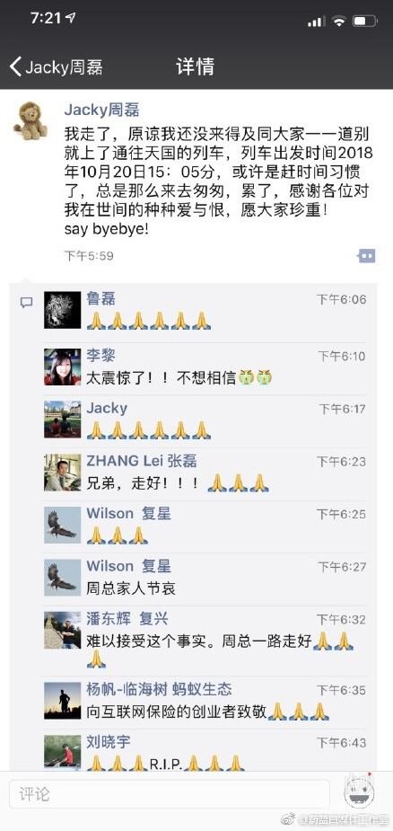 10月20日,大特保CEO周磊的家人通过他的个人微信朋友圈公布了周磊去世的消息。