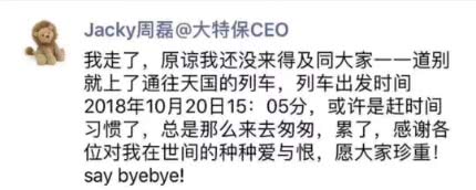 “我走了,原谅我还没来得及同大家一一道别就上了通往天国的列车,列车出发时间2018年10月20日15:05分,或许是赶时间习惯了,总是那么来去匆匆,累了,感谢各位对我在世间的种种爱与恨,愿大家珍重!say byebye!”