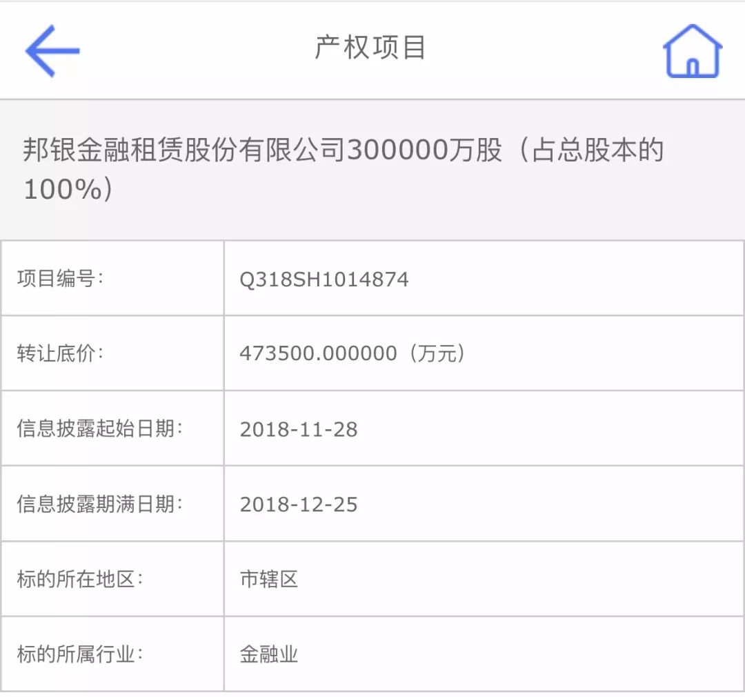 上海联合产权交易所11月28日发布的一则信息显示,邦银金融租赁股份有限公司的30亿股股份正在挂牌转让,占总股本的100%,作价47.35亿元。