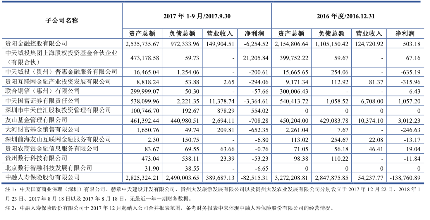 尽管如此,从2015年开始,原中天城投以贵阳金控为主体,开始在金融领域纵横捭阖,迅速揽得友山基金、海际证券(即中天国富证券)、PE、中融人寿、中天普惠金服、贵州金融资产交易所、招商贷等多张金融牌照,此外,还申请发起设立华宇再保险公司和百安互联网保险,申请筹建贵安银行等,还有意收购四川信托股权但未果。