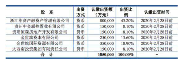 3月2日,金世旗产投注册资本从105亿元变更至185亿元。但其相关公告显示,截至3月23 日,金世旗产投累计仅收到股东投资款24.6亿元,六家股东皆未如期全额出资,其中贵阳恒森和浙商产融皆未出资,最终与其原计划收到的款项相差甚距。