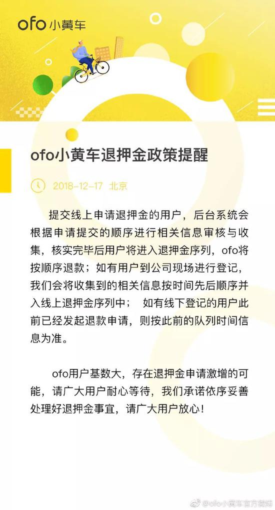 ofo方面对此回应称,确实有少量用户到ofo总部办公室申请退押金,ofo对申请退押金超过15个工作日逾期未退的用户进行了登记,并将重新核查,并无现场退押金的情况。
