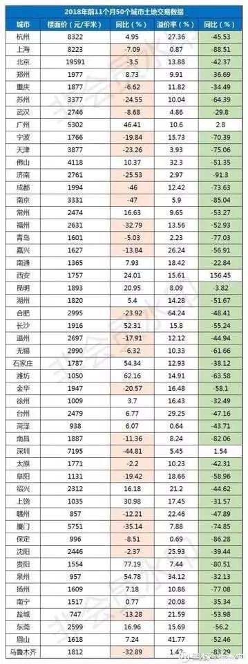 中原地产研究中心近期发布了2018年前11个月50个城市土地交易数据。数据显示,有27个城市楼面价出现下跌。其中,南京、成都两个城市楼面价同比分别下跌47%和46%,分列前两位,深圳楼面价同比下跌44.81%位居第三位,厦门、乌鲁木齐福州三个城市同比下跌均超过30%,苏州、天津、济南、合肥、金华等5个城市均下跌超过20%。
