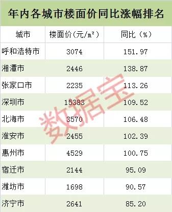 在楼面价数据较为失真的情况下,其涨跌情况的真实性也就值得怀疑了。数据宝统计的数据显示,101城市中,有64个城市今年住宅成交楼面价同比上涨,占比超过六成。其中,呼和浩特、湘潭、张家口等7个城市楼面价同比翻倍上涨。