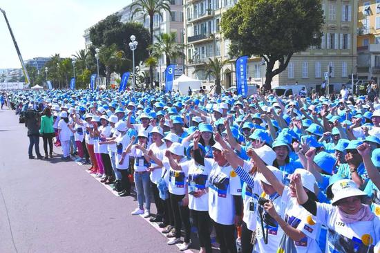 6200余名来自中国的员工和直销伙伴们,身着统一的服装,喊着一致的口号,将尼斯海滩塞满了。