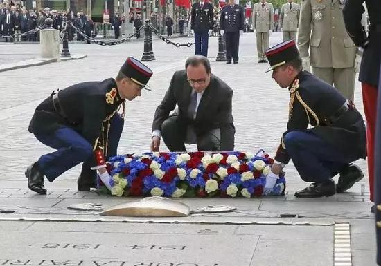 在法国的巴黎,总统奥朗德在凯旋门,敬献花圈,并阅兵。