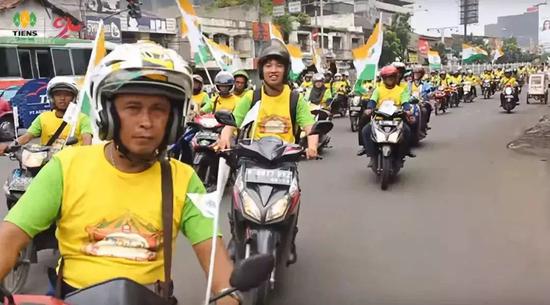 2015年1月,天狮集团在印尼15周年业务启动大会上,接受信仰伊斯兰教的电视台记者采访。她们深受感动,会后号召加入天狮的伙伴们,骑着最爱的电驴车,驶过万隆的大街小巷,天狮的旗帜遮蔽了当地人的视野。