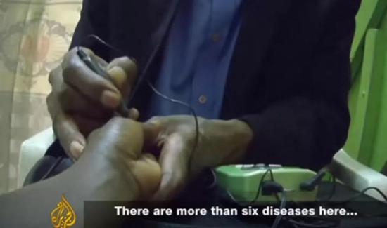 他们在黑非洲推广销售一种贯彻中医理念的神奇诊疗仪器,任何无医疗资质的人,都可通过看手掌经络诊断疾病。纪录片显示,只要用这种仪器轻轻接触下手指,便断定说这个黑叔叔至少有6种疾病。
