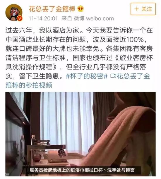 前不久,网友@花总丢了金箍棒 曝光近20家五星级酒店存在卫生乱象:服务员用浴巾擦杯具、马桶、镜面、洗手池;将一次性杯盖从垃圾桶拣回重复使用等。