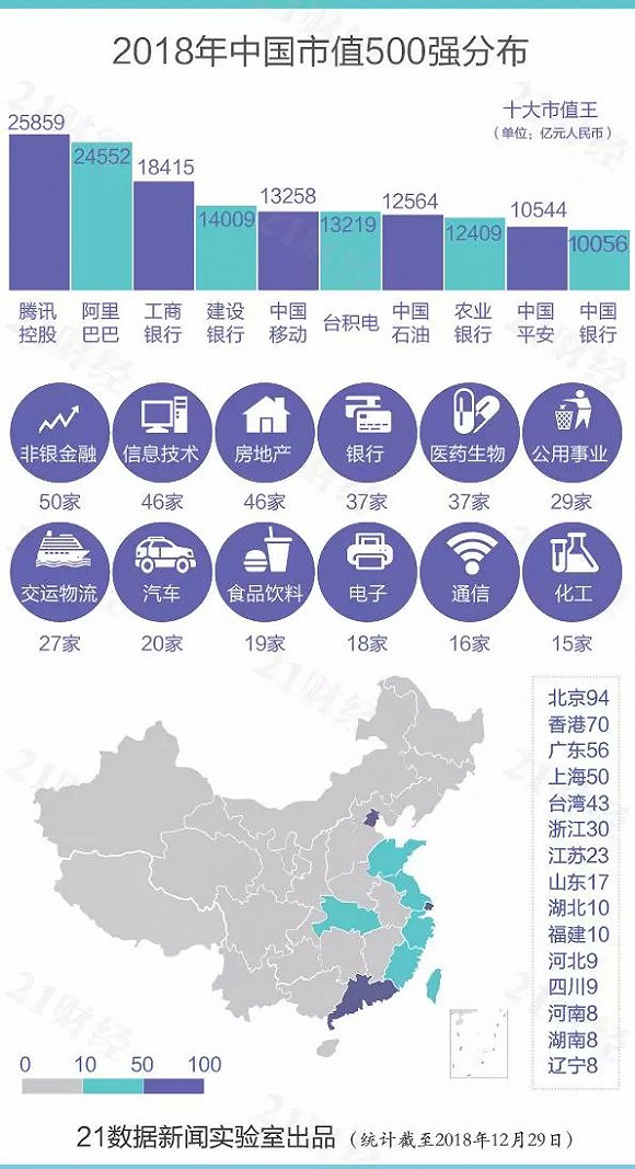 21数据新闻实验室汇总上海、深圳、香港、纽约等15个交易所上市的上市公司最新市值数据,得出“2018中国上市公司市值500强榜单”。
