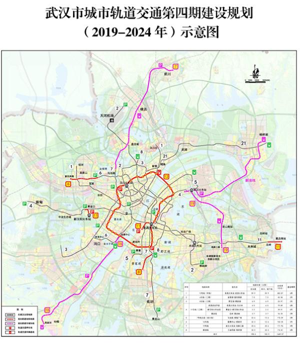 武汉市城市轨道交通第四期建设规划包括12号线、6号线二期、8号线三期、11号线三期(武昌段首开段、新汉阳火车站段和葛店段)、7号线北延线、16号线、19号线、新港线项目,总长198.4公里,其中:地铁项目4个(含延伸线)、总长81.7公里;市域快线项目4个、总长116.7公里。到2024年,武汉将形成14条线路运营、总长606公里的轨道网。