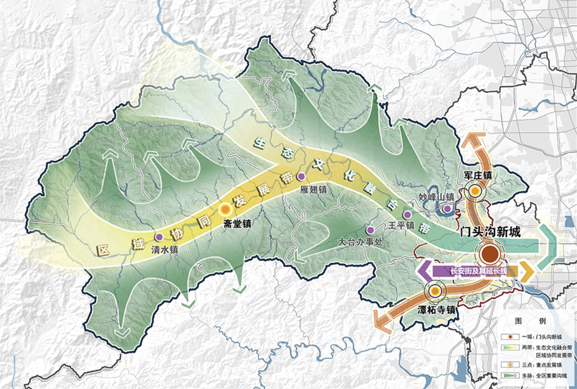 门头沟的空间结构为一城、两带、三点、多脉。其中,三点指,潭柘寺、军庄、斋堂三个重点发展镇。