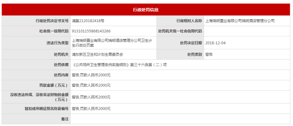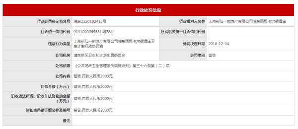上海浦东新区卫计委对上海浦东丽思卡尔顿酒店作出行政处罚。图片来源:信用中国(上海.浦东)官网