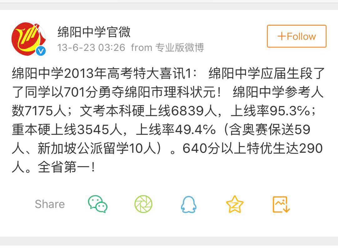 2013年绵阳中学官微发布高考喜讯,段了了以701分获得绵阳市理科高考状元。
