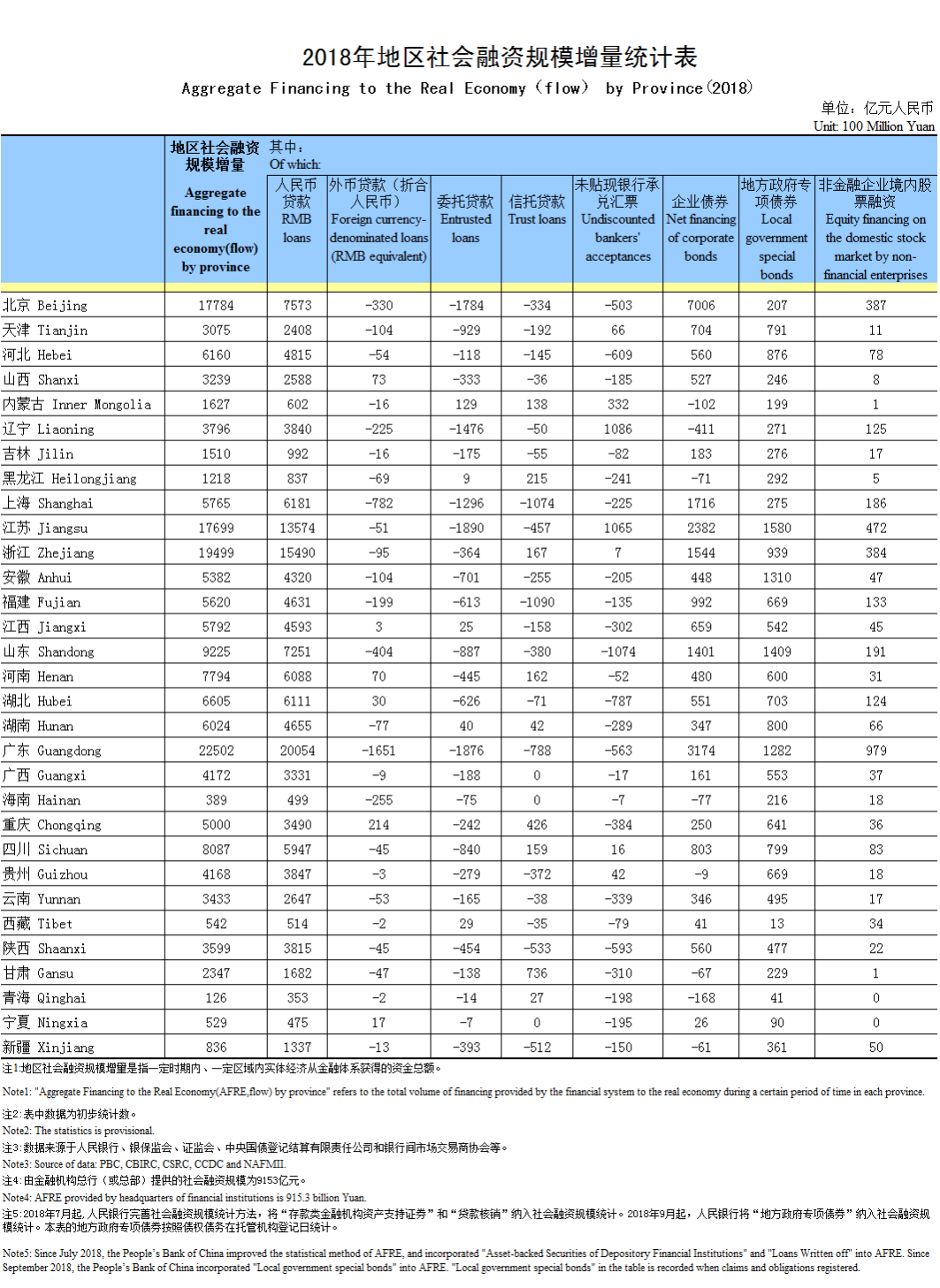 央行公布2018地区社会融资规模增量统计 广东排第一