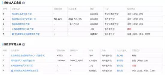 特别值得一提的是翟天临花2000万元全资控股、担任法人的企业——青岛捌柒文化投资有限公司。