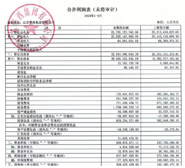 华西集团合并利润表显示,2018年前9个月公司营业总收入为227.2亿元,公司营业总成本为229.35亿元,总成本已高于总收入。