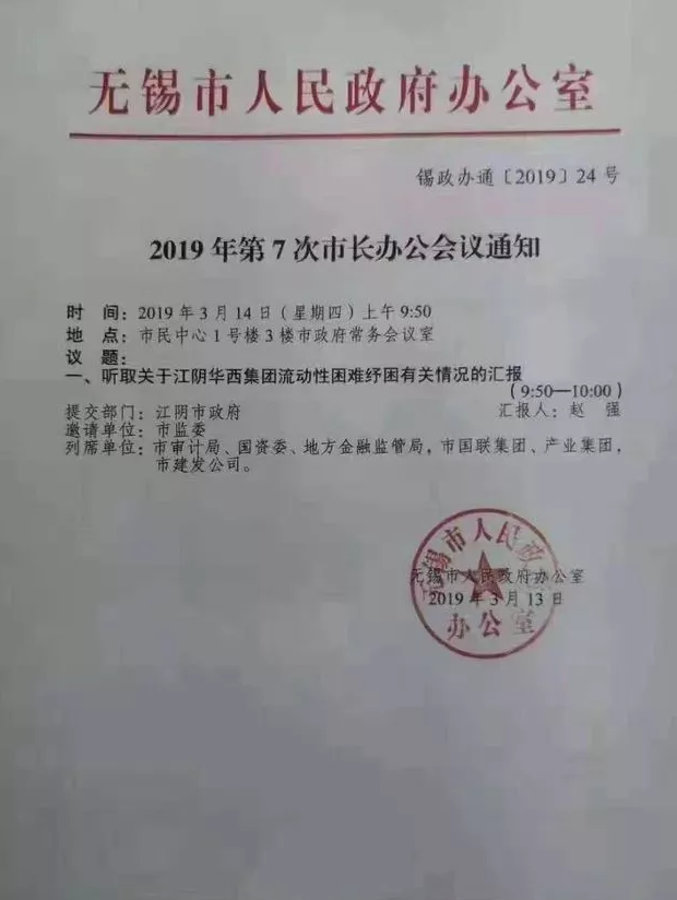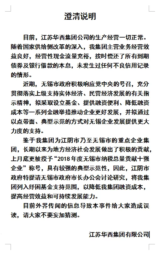 华西集团称,鉴于公司为江阴市乃至无锡市的重点企业集团,长期以来为地方经济社会发展做出了积极的贡献,上月底更被授予“2018年度无锡市纳税总量贡献十强企业”称号,具有较强的典型示范性。因此,江阴市政府特请无锡市政府市长办公会讨论研究,将华西集团列入纾困基金支持范围,以降低融资成本,提高经营效益和可持续发展能力。目前外界传闻的信息导致本事件给大家造成误解,请大家不要妄加猜测。