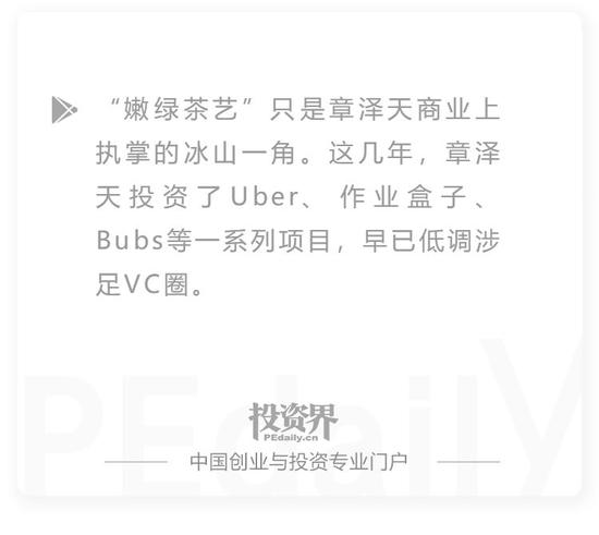 “嫩绿茶艺”只是章泽天商业上执掌的冰山一角。这几年,章泽天投资了Uber、作业盒子、Bubs等一系列项目,早已低调涉足VC圈。
