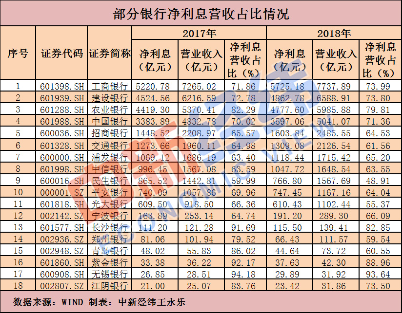 净利息营收占比最高的无锡银行在年报中称,2018年,实现利息净收入29.89亿元,同比增长11.31%,是营业收入的主要组成部分。利息净收入增长的主要因素是生息资产规模增长。(中新经纬APP)