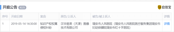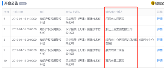 值得一提的是,通过启信宝数据可以看出,在众多的诉讼对象中,视觉中国似乎尤其对医院情有独钟,仅2019年4月,即将或已经开庭的诉讼中,起诉对象就包含乐清市人民医院、嘉兴市第二医院、湖北省中医院、余姚市人民医院、上海集益口腔门诊部有限公司、瑞安市人民医院(瑞安市人民医院医疗服务集团瑞安市妇幼保健院瑞安市红十字医院)等多家医疗机构。