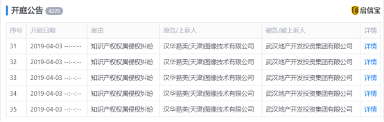 当然,不仅是医院,收入不菲的房地产行业也成为视觉中国的“关注焦点”。2019年4月3日,武汉地产开发投资集团有限公司成为汉华易美的被告,开庭案件号竟然多达19条。