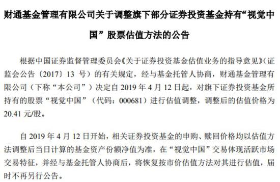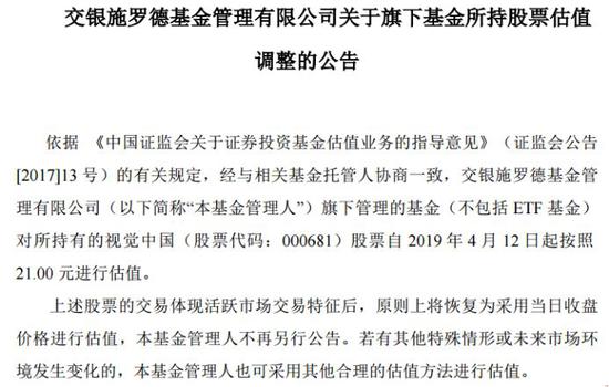 无独有偶,交银施罗德也在今日对外发布所持股票估值调整的公告:旗下管理的基金(不包括ETF基金)对所持有的视觉中国(股票代码:000681)股票自2019年4月12日起按照21.00元进行估值。除此之外,财通、博时基金也均对视觉中国给出20.41元的估值。