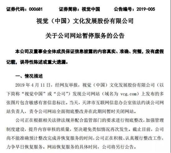 视觉中国12日早间公告,截止目前,公司尚不能准确预计整改完成并恢复服务的时间,正在积极、认真履行整改工作, 力争早日恢复服务。网站恢复服务的具体时间,公司将另行公告。