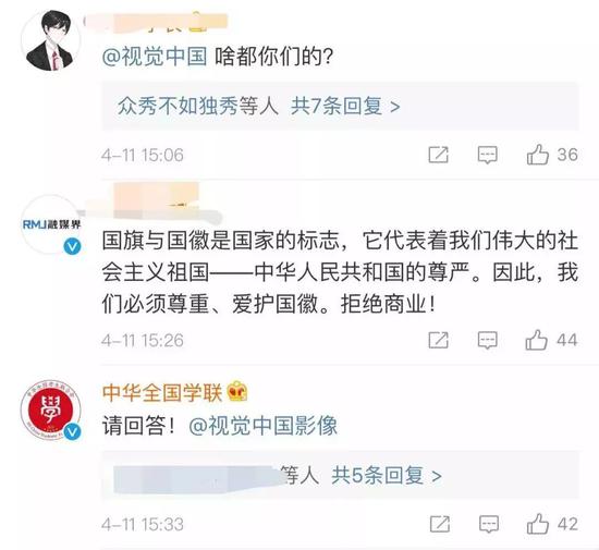 15点后,共青团中央的微博“国旗、国徽的版权也是贵公司的?”使“视觉中国”舆情出现了第一个“高峰”。与此同时,各大知名企业也发现自己的logo和商标被视觉中国贴上了“版权所有”的标签。网民吐槽声不断。
