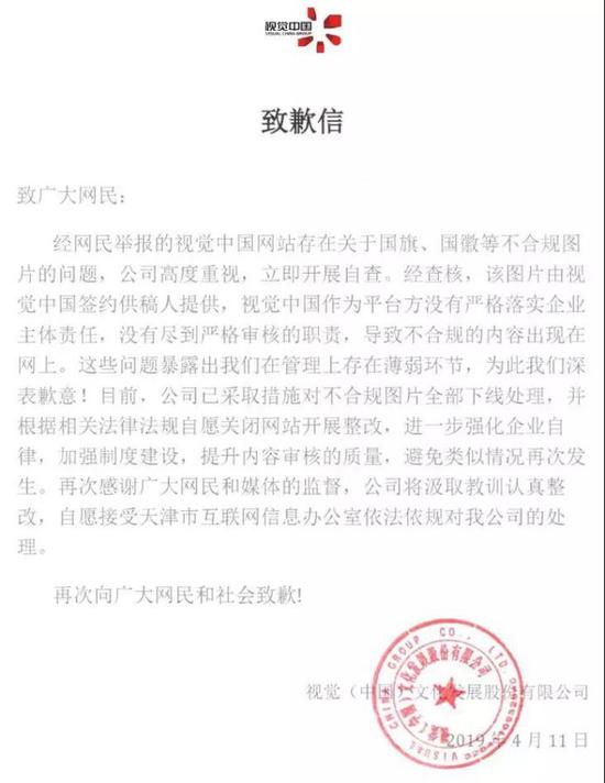 视觉中国在其微信号“VCG视觉中国”发布致歉信,称接受广大网民和媒体的监督批评,全面配合监管部门彻底积极整改。