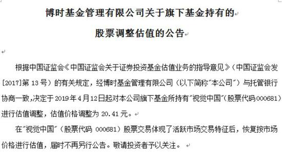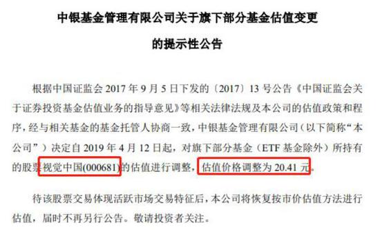 昨日晚间,中银基金在深交所发布发布基金估值调整的提示公告,公告中称,自2019年4月12日起,对旗下部分基金(ETF基金除外)所持有的股票视觉中国(000681)的估值进行调整,估值价格调整为20.41元。