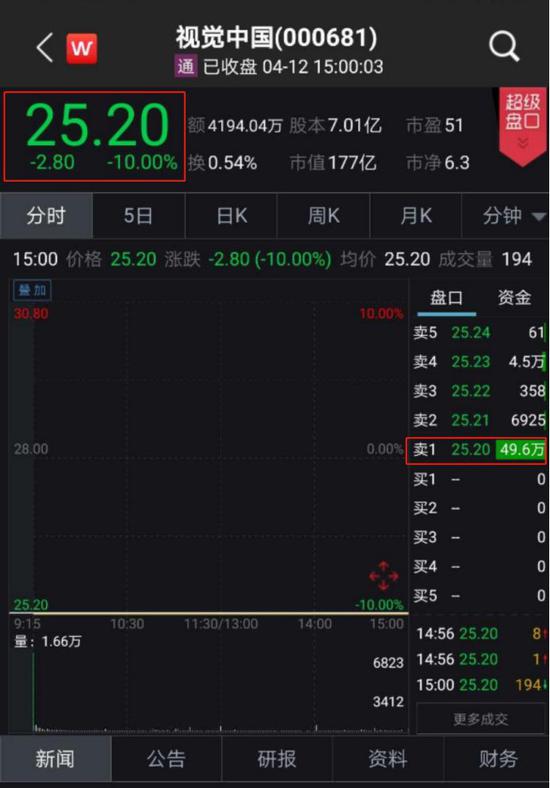 视觉中国4月12日开盘毫无悬念封死跌停,以25.20元最新收盘价计算,单日市值蒸发20亿,收盘封单金额高达12.5亿元,截至收盘,卖一盘后仍有近50万手卖单。