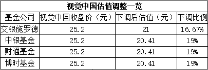 从昨日晚间至今日,中银基金、交银施罗德、财通、博时等多家基金公司接连发布调整视觉中国估值的公告,最多下调至20.41元,相当于在4月12日收盘价25.20元基础下按照2个跌停板估值。