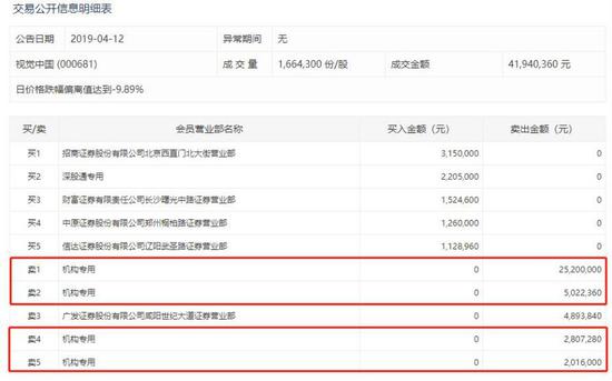 深交所公布的龙虎榜数据显示,4月12日龙虎榜资金净卖出视觉中国超3000万元,卖出前五席位合计净卖出3993.95万元,,4家机构专用席位现身其卖出席位,合计净卖出3504.56万元。视觉中国12日成交额仅4194万元,可见当日成功出逃的资金以机构居多。