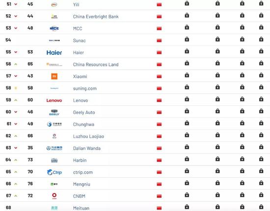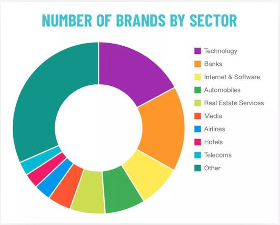 网站还统计了各行业品牌数量的比重情况,其中科技类品牌最多,为86个;其次为银行品牌,上榜80个;互联网以及软件品牌上榜40个;其余分别为汽车品牌38个、房地产服务品牌33个、媒介品牌22个、航空品牌16个、酒店品牌14个以及电信品牌13个。