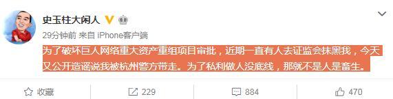 22:18分,史玉柱再度发布微博称,“为了破坏巨人网络重大资产重组项目审批,近期一直有人去证监会抹黑我,今天又公开造谣说我被杭州警方带走。为了私利做人没底线,那就不是人是畜生。”
