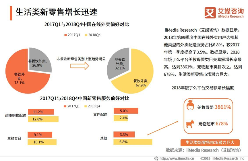 就具体品类而言,在线外卖新零售中,美妆母婴、药店类目最受欢迎,宠物超市、肉禽蛋品增长可期。艾媒数据显示,2018年饿了么的美妆母婴板块销售同比增长3861%,宠物超市增长678%。