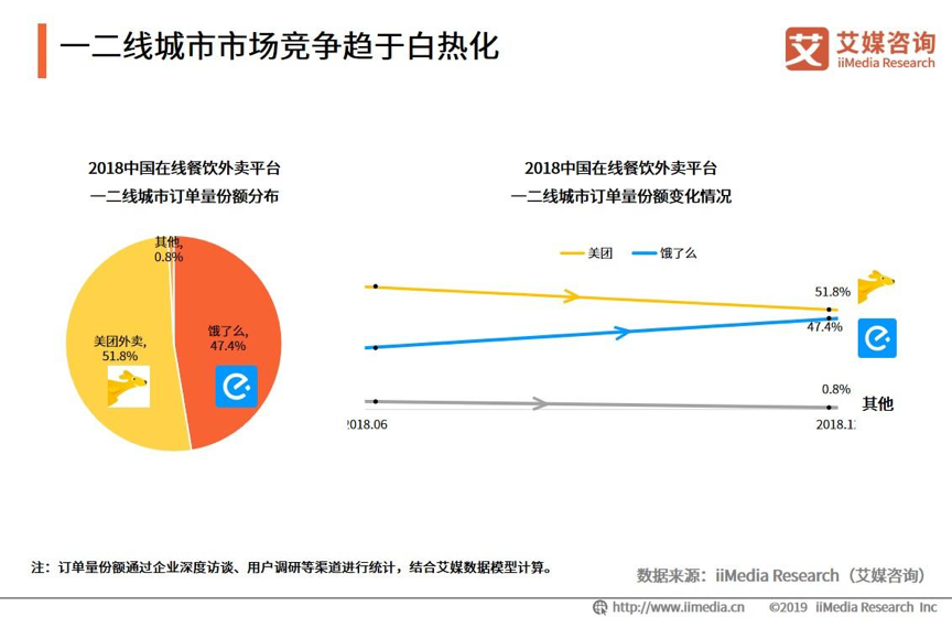 就行业格局来看,随着2018年在线外卖行业进一步发展,饿了么和美团在一二线城市的竞争更趋激烈,饿了么份额达到47.4%,两者之间差距进一步缩小。报告分析称,未来一二线城市竞争升级的情况下,在下沉市场的发展也至关重要。