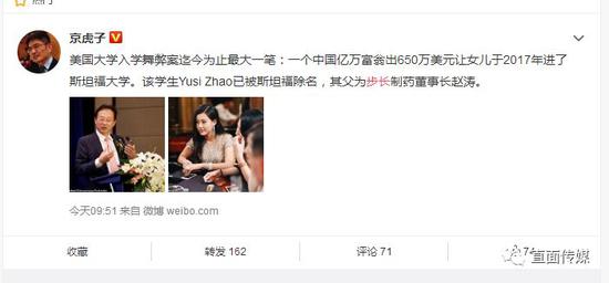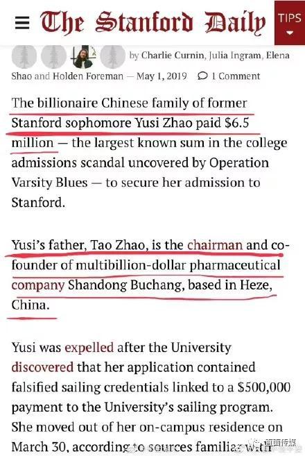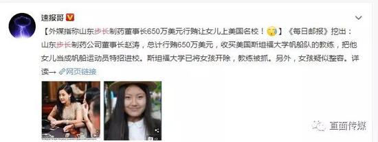 消息还说:《每日邮报》挖出:山东步长制药公司董事长赵涛,总计行贿650万美元,收买美国斯坦福大学帆船队的教练,把他女儿当成帆船运动员特招进校。斯坦福大学已将女孩开除,教练被抓。另外,女孩疑似整容。