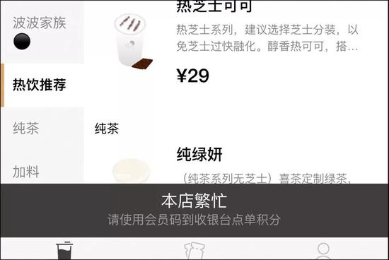 周末早上十点半,喜茶(三里屯黑金店)开门半个小时,已经有人在排队了。虽然门口贴着小程序下单的通知,但不少消费者表示使用小程序点单主要靠缘分,经常出现“本店繁忙”,只能老老实实排队购买。