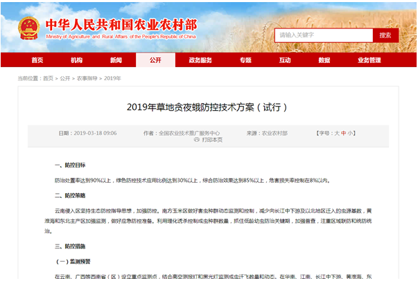 今年3月,农业农村部发布了《2019年草地贪夜蛾防控技术方案(试行)》(下称《方案》),要求加强监测预警,分区重点防控,做好应急防控准备,确保早发现、早控制。