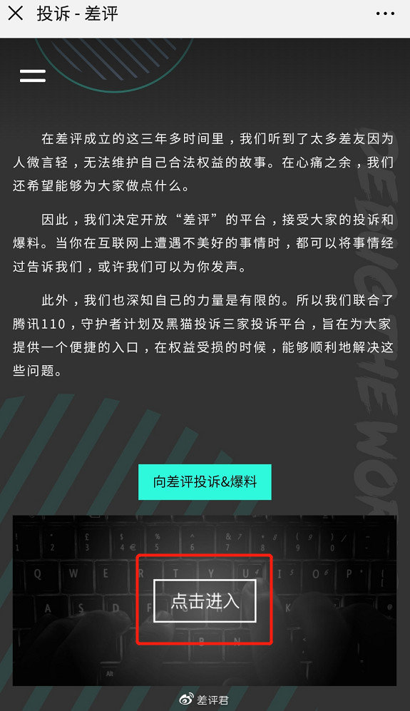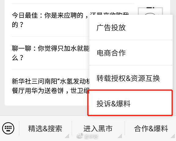 微信公众号界面下点击 “ 投诉&爆料 ”